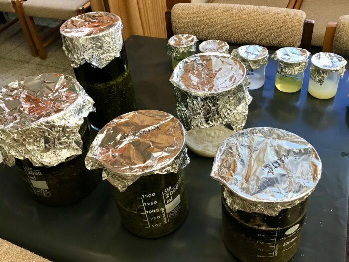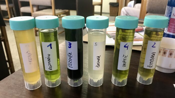 Čekají tu na nás také rostlinné extrakty, které mohou být využity jako postřik (např. česnekový, pelyňkový, rozmarýnový, vratičový, řimbabový). Učíme se je připravit i aplikovat. Protože jde o látky, které mohou být toxické i pro člověka, je důležité při manipulaci dbát na bezpečnost a používat ochranné pomůcky. Oceňuji nasazení přednášejícího, který pro pedagogický efekt ukazuje, jak k bezpečnosti práce nepřistupovat. Do zkumavek vzorky nalévá bez rukavic a trychtýře, takže vydatně polévá sebe i vše okolo. “Přesně takhle to nedělejte”, usmívá se.